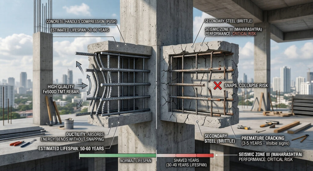 3. Seismic performance drops. This one matters in Maharashtra. Mumbai and surrounding regions fall in Seismic Zone III. In an earthquake, the ductility of your steel its ability to bend without snapping is what gives a building the ability to absorb energy rather than collapse suddenly. Low-ductility steel in Zone III is not a theoretical problem. It’s a real one.